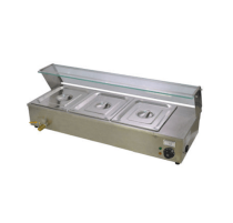 - • GLASS COVER BAIN MARIE BM • without drainage Valve • 4* G/N 1/3 PAN +1 *G/N 1/2 PAN • power: 220V / 50HZ / 1.8 kw • dim: 910 x 350 x 320 mm • BM-3S